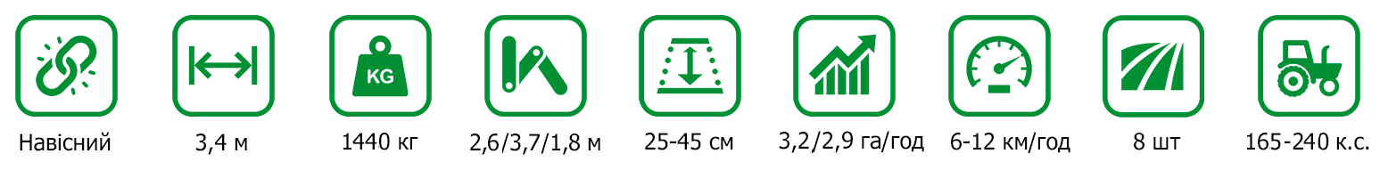 Гарантійний строк глибокорозпушувача навісного ГР-3,4 становить 12 місяців та не більше 425 га обробленого ґрунту.