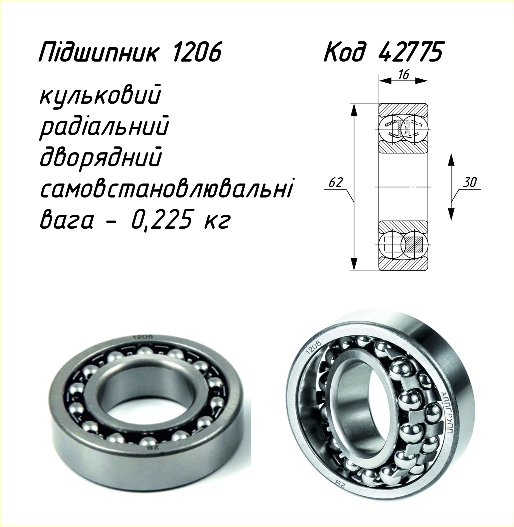 Підшипник 1206 — це дворядний самовстановлювальний кульковий підшипник, який виготовлено згідно з вимогами ГОСТ 5720-75. Його конструкція дозволяє компенсувати перекоси валів або деформацію корпусів, що робить його ідеальним для умов, де важливо зберігати стабільну роботу за наявності монтажних похибок.